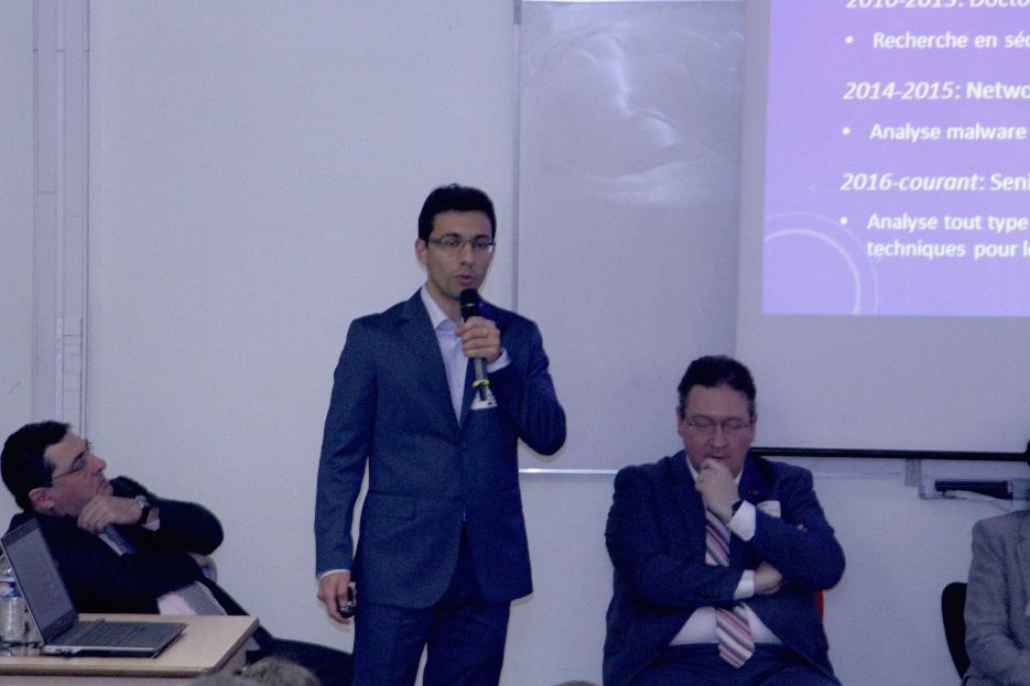 Ces menaces ont d’abord été détaillées par nos jeunes talents, Davide Canali (promo 2014) et Thomas Tranier (promo 2015) évoquant les dernières grandes tendances 2016, des techniques et un savoir-faire qui est de plus en plus pointu, construit sur de la pluridisciplinarité, du partage des tâches et des spécialisations (concepteur de malwares, opérateurs de botnets, capture et construction de base de cibles à partir des réseaux sociaux). Des remarques pertinentes ont été faites sur la formation exigeante et continue qui leur est nécessaire pour rester experts du domaine, de la nécessité de passion pour le hacking qui demeure et qui reste le point d’entrée déterminant pour les carrières d’experts.